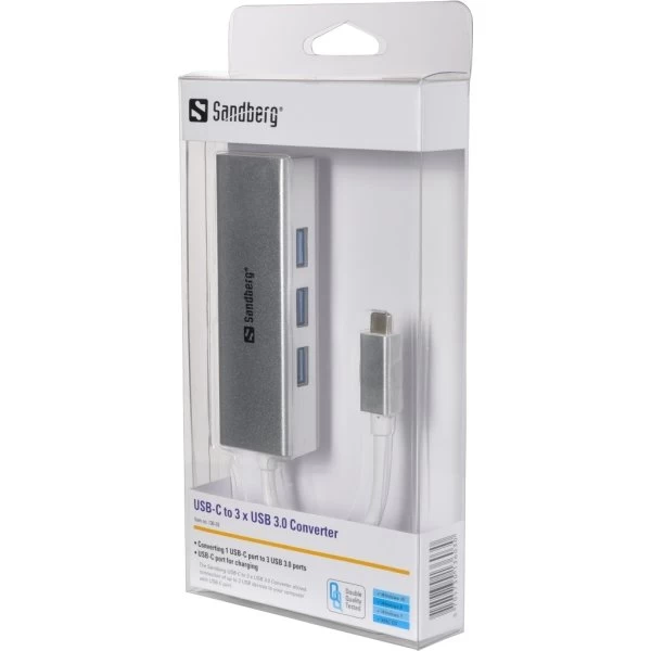 Med Sandberg USB-C to 3 x USB 3.0 Converter får du rig mulighed for tilslutning af ekstra USB udstyr på din computer med USB-C port. På den måde kan du f.eks. have ekstern harddisk, printer og mus tilsluttet samtidig. USB-C stikket er videreført til strømtilslutning, så f.eks. din Macbook ikke løber tør for strøm, mens dock’en er tilsluttet.